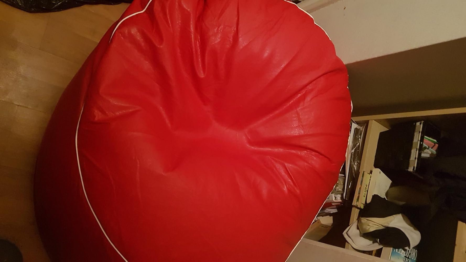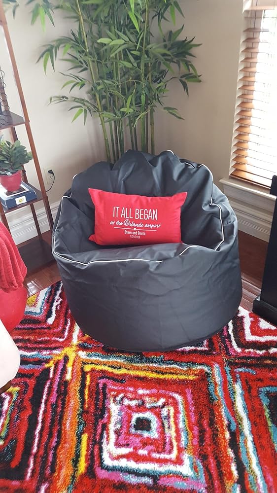White bean bag chair with black piping on a white background
